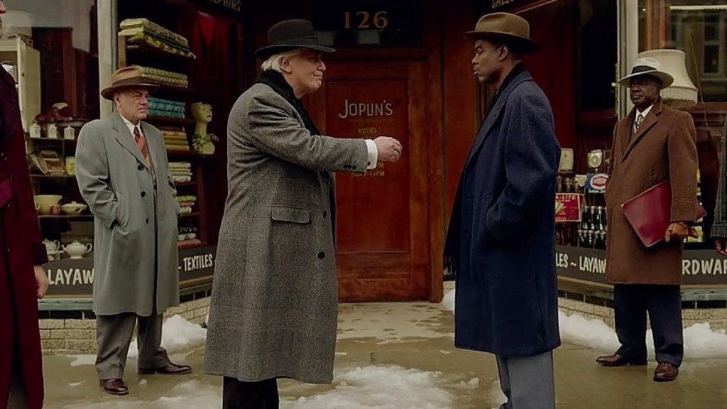 This idea of prejudicial assumption also weaponized in a playful visual gag involving the meeting of a series of mob families. Continuing the percussive musical editing pattern, Ethelrida’s history report travels back in time to when Jewish families ran crime in KC, before the Irish showed up to spit and shake their hand. Unbeknownst to the audience at this point, the show is also introducing us to a key character who connects the fourth season to the second, Rabbi Milligan (Ben Whishaw), a young lad in a bowler hat (he appears to be the series’ Tom Reagan), who is traded to the rival crime family as a gesture of good faith. He will eventually turn on his “Hebrew” captors, leading him to earn his moniker from his whisky drinking brethren – being told the story of Goldilocks, and the problem of someone “sleeping in his bed,” and “sitting in his chair,” Milligan’s father using a children’s story to fuel the hateful fire of his offspring. Years later, the boy will be exchanged, again, when the Italians roll into town. Clearly wounded by a family that values him more as property than a person, Milligan betrays and murders his father, ending up on the opposite side of a coup the young man is no stranger to. When the next crime family generation arrives, The Cannon Limited, headed by Loy Cannon (Chris Rock), rival boss, Fadda, looks around, slightly bemused “Did you come alone?” No, Don Fadda, he did not.