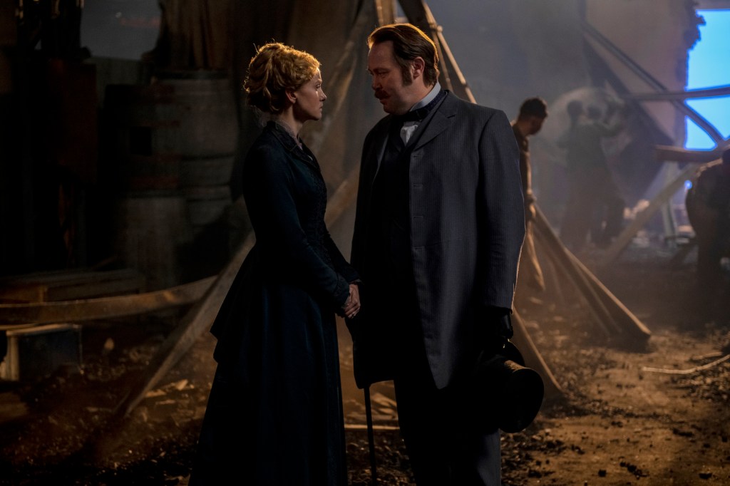 With the exception of an escapade to Sonoma Valley, and a couple of scenes following up Sophie (Celine Buckens) and Leary’s (Dean Jagger) botched stealth-bombing of Mercer Steel, the episode mainly revolves around the Fung Hai raid operation, crosscutting action as Chao goes undercover to bring Zing down. The hour begins with Penny (Joanna Vanderham) walking amongst the rubble of what remains of her factory, half the place blown to splintered smithereens. Her valet and helping hand, Jacob (Kenneth Fok, whom I wished the series utilized more), informing her that a plethora of destroyed opium crates has been discovered. Realizing Ah Sahm (Andrew Koji) has been using her to further the gains of the Hop Wei, on top of their agreement, a relationship that seemed to be mending blows up in the faces of both parties. This turn of events is very fortunate for Mayor Blake (Christian McKay), however, who, having sought legal council of his own, gloats to his wife over her inability to meet the terms of a brokered arrangement, the act of terrorism having immediate impact on the mill’s operational capacity.