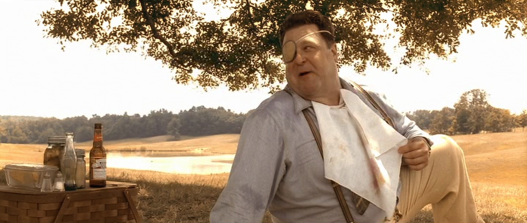 Clooney’s character is also the most similar the Brothers have concocted to “Raising Arizona’s” H.I. (Nicolas Cage), who sets off that film’s conflict by stealing a rich public figure’s quintuplet. Ulysses is trying to make his way back to five little Telemachus’ himself, a clever callback to one of its cinematic companion pieces. Both films deal with a specific subset of outlaw country life – in particular, the American stereotype/cultural mythology of the harebrained hillbilly – character’s drawls rambling on about their subjective prejudices, much like Timothy Olyphant’s U.S. Marshall Dick “Deafy” Wickware – a Mormon prone to rant about the “neophytes” who proceeds to groom himself in the mirror at the prison break crime scene – his educated but ignorant motormouth and obsession with looks being very reminiscent of Clooney’s narcissistic inmate on the run, a man obsessed with a particular brand of hair grease called “Dapper Dan.”